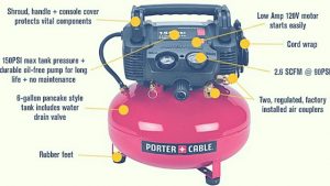 PORTER-CABLE Air compressor is constructed with a pancake style container for maximum balance, water strain device, rubberized feet and a 150 PSI. The greater stress design provides longer air tool efficiency and comes with a 2.6 SCFM at 90 PSI allowing for a quick a chance to recover. Contains an oil 100 % free push for no maintenance, low AMP 120V engine quickly starting in cool temperature or with expansion wire, improved wrap with hand and system cover defending vital elements. Made for simple moving and contains wire cover with a 6 quart capacity. Product has a one year limited assurance on compressor elements. Highly convenient and extremely simple to use, the Porter-Cable C2002 150-PSI, Six-Gallon Oil-Free Pancake Air compressor features a big impact in a small package. Perfect for everything from filling wheels to shooting nailers, this compressor functions an introduction engine that provides extended life and the best possible efficiency. For comfort, this effective unit operates off normal household power and offers mess-free, oil-free function. At just 34 pounds, the C2002 is light and portable and convenient enough for work site, work shop, or around-the-house use. This means it’s your best option for a range of jobs–everything from setting up cut to bolstering air beds.
