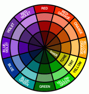 A color wheel organizes the visible spectrum of colors and shows the relationships between them. The color wheel is made of three types of colors; primary: your red, yellow, and blue, Tertiary: your red-orange, yellow-orange, yellow-green, blue-green, blue-violet, and red-violet, and then secondary colors: orange, green, and violet. Within the color wheel are monochromatic colors, such as variations of shades and tints of one color. There are also complementary colors, those are colors that are opposite of each other on the color wheel such as red and green. A Triad is a when you bring all of the primary colors together. Analogous colors are colors on either side of the primary colors are great for accent colors are for use on their own.