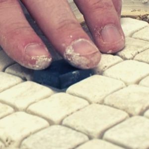 Before you cement the tiles in place, you have to prepare the tiles for the mosaic sections. How do you do that? This is where you can get some aggression out. Take a mix of tiles, wrap them in a towel and give them a whack. This is the simplest way to get the broken pieces of tile you’ll need for the mosaic. For the border mosaics you are going to need some smaller pieces of tile. For the smaller pieces you use a tile nibbler to break off pieces the size you need. To cement the tiles in place, use mortar that you can buy at any tile store or home improvement store. You just trowel the mortar on about 1/8th inch thick. Then use the edge of the trowel to score the mortar. Then just put your tiles in place. For the mosaic sections you use the same process. Take the different pieces of tile and arrange them however you like. Try and keep the spaces between the tiles to 1/8th of an inch.