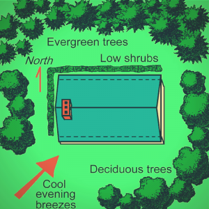 The second consideration is windbreaks. A windbreak will protect your home from chilling winter gusts therefore requiring less energy to heat. Efficient windbreaks extend to the ground and consist of well placed trees and shrubs.