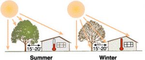 A tree shading the sides or roof of the house will be seven times more effective in reducing heat in summer than pulling heavy drapes over the windows while the sun is shining on them. As water evaporates from the leaves of the trees, a natural cooling also occurs. Large trees, such as red oak, sugar maple, ash or cypress might be considered for this purpose. After the leaves fall, the sun’s rays warm the walls during cold weather. Where there is no room for large trees to shade the west or south walls of a home, vines either climbing directly on the wall, or on large trellises can also be used to shade the wall and help reduce energy consumption.