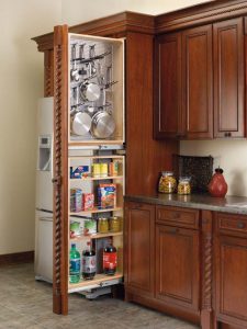 Pull-out pantries also make for more efficient storage. These are like drawers but vertical instead of horizontal. Normal pantries with shelves are often made with less depth, as it is difficult to access the very back of the unit. A pull out pantry allows for easy access to the entire depth of the unit thus increasing storage space.