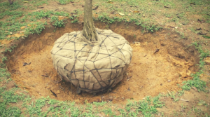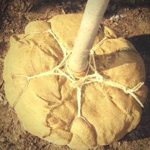 Genuine burlap will rot quickly underground and does not have to be disturbed before planting. If you’re not sure or suspect a poly type burlap, you don’t have to remove it completely, but should loosen it around the stem of the plant and cut some vertical slices around the circumference of the ball.