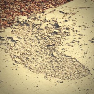 Generally, concrete that flakes, breaks, or looses chunks is the result of a bad mixture during its original installation. This does not indicate that the whole area is liable to crumble, as often, concrete uses sand, cement mixture, gravel, and water, so clumps of sand that fail to break up or chunks of cement mixture that do not crumble well during the original mixing can provide for problems later.